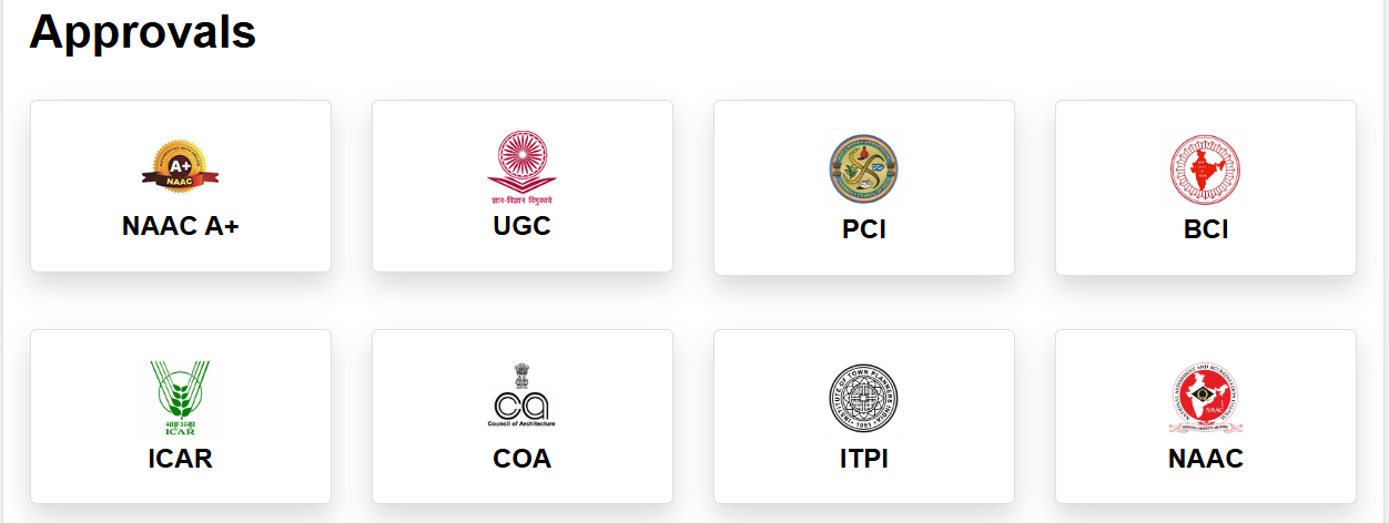* Other Approvals: Recognized by the UGC and approved by various professional bodies including AICTE, BCI, COA, PCI, and AIU.